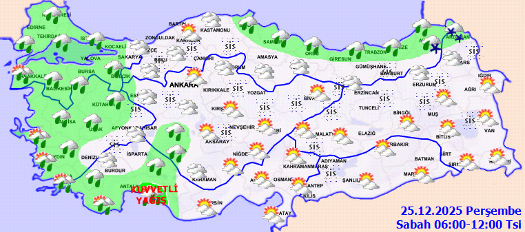 Yağışların, Antalya’nın doğusunda yer yer kuvvetli olması bekleniyor. Kuzey, iç ve doğu kesimlerde yer yer sis ve pus hadisesi bekleniyor.